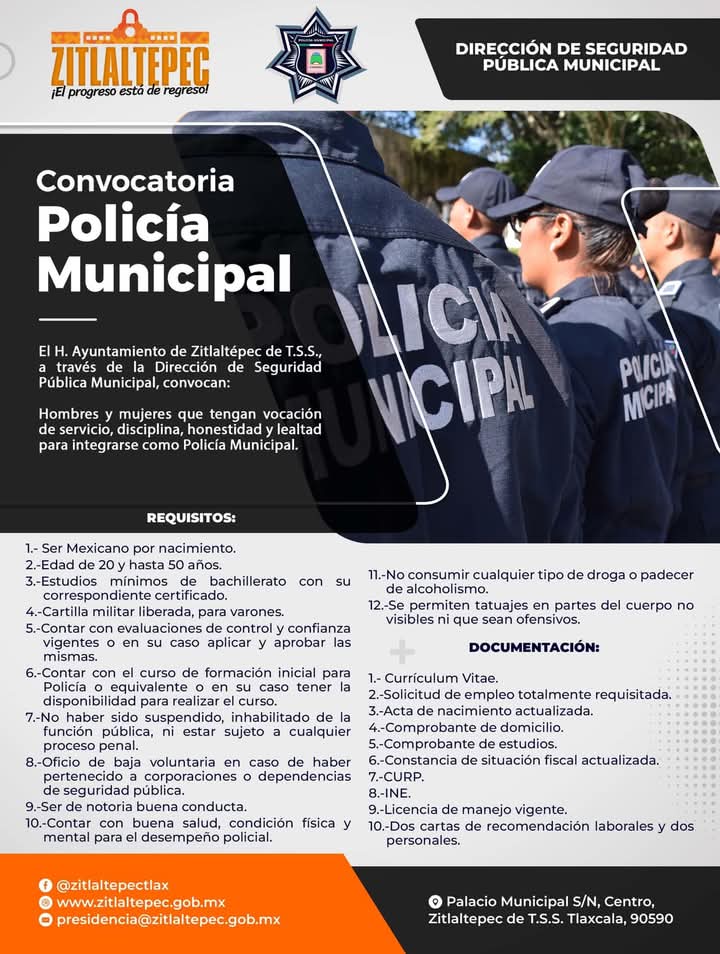 Leer más El Director de Seguridad en el Municipio de Zitlaltepec de Trinidad Sánchez Santos, Luis Alberto Fernández Ortega, dijo que con el objetivo de reforzar esta área del ayuntamiento, se ha hecho pública, la convocatoria de reclutamiento. En este sentido, Fernández Ortega agregó que principalmente se busca el perfil de policía municipal, por lo que los […]
